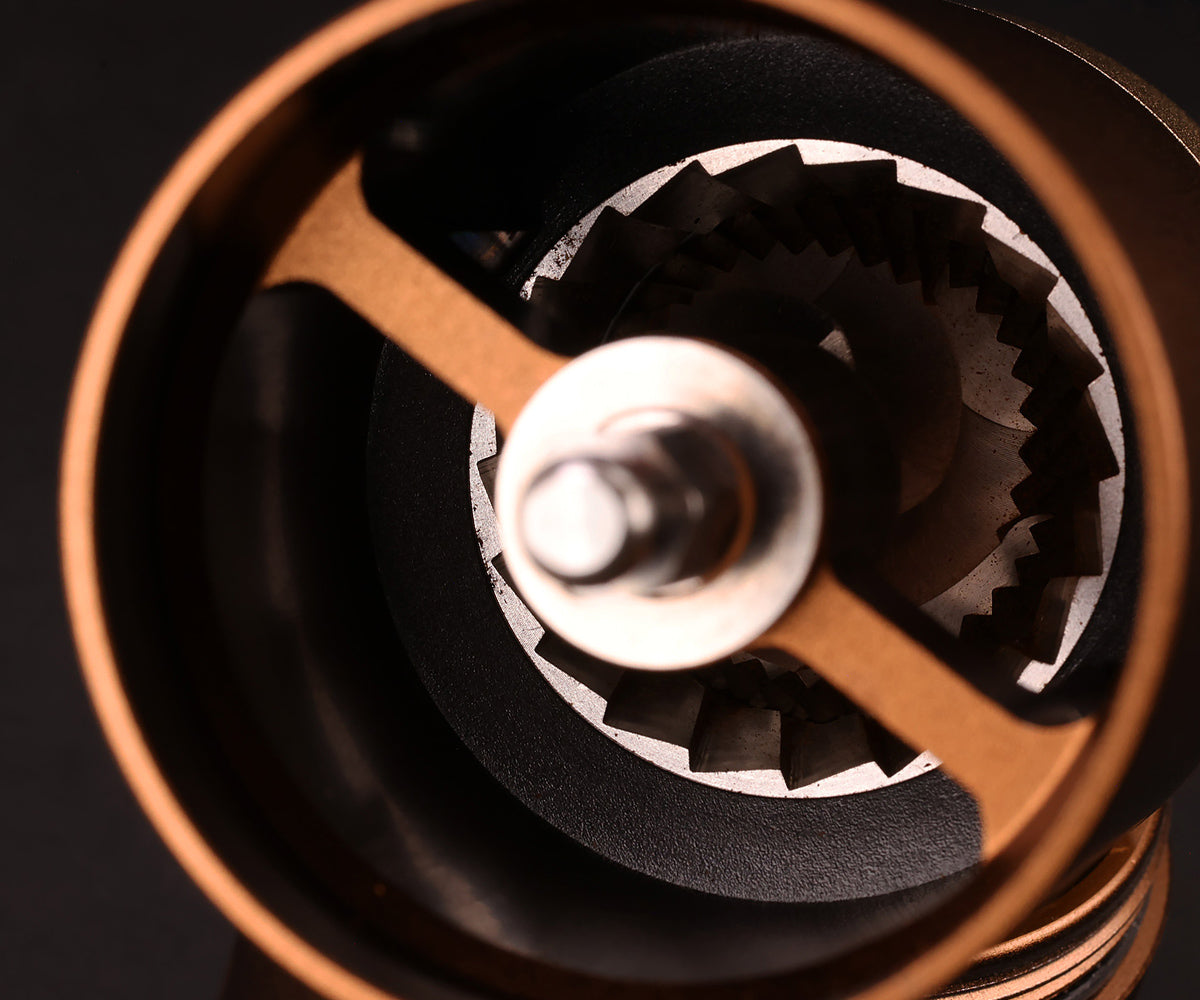 - Disassemble the grinder by removing the handle, top burr, bottom burr, and grind adjustment ring, if applicable.